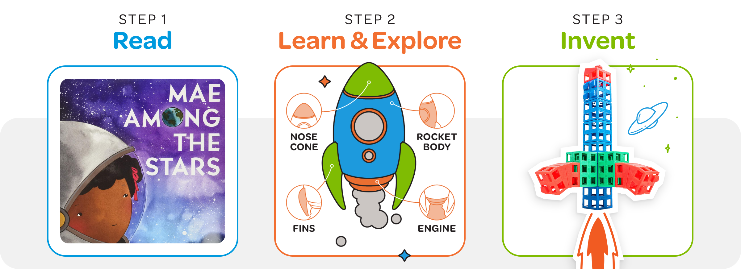 Read: Every lesson begins with a carefully selected children’s book. Educators lead a read-aloud that introduces lesson themes and a challenge or idea to inspire STEM exploration.