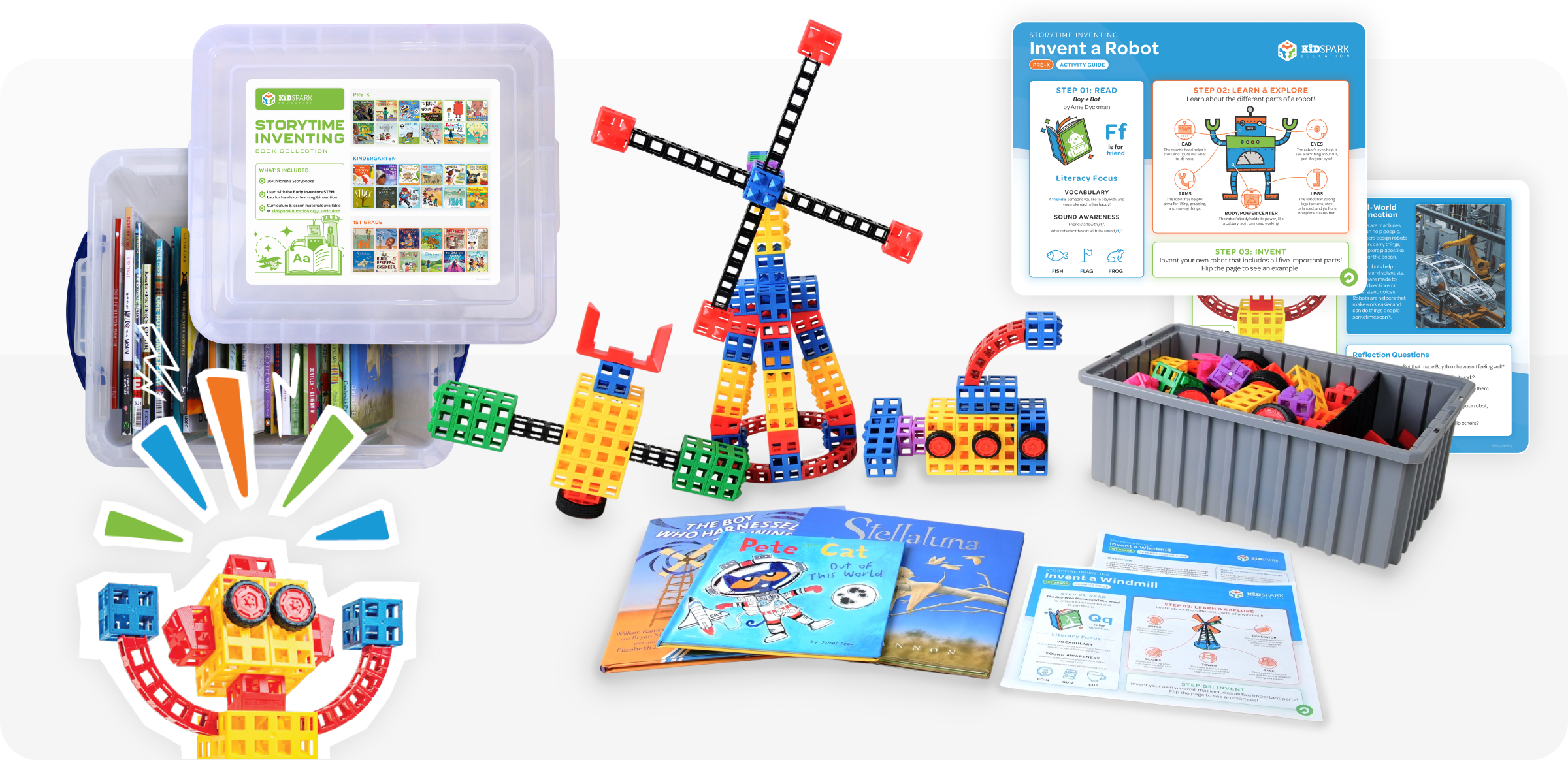 Invent: Students move into hands-on invention, using the Kid Spark Early Inventors STEM Lab to design a solution connected to the story's problem or idea.